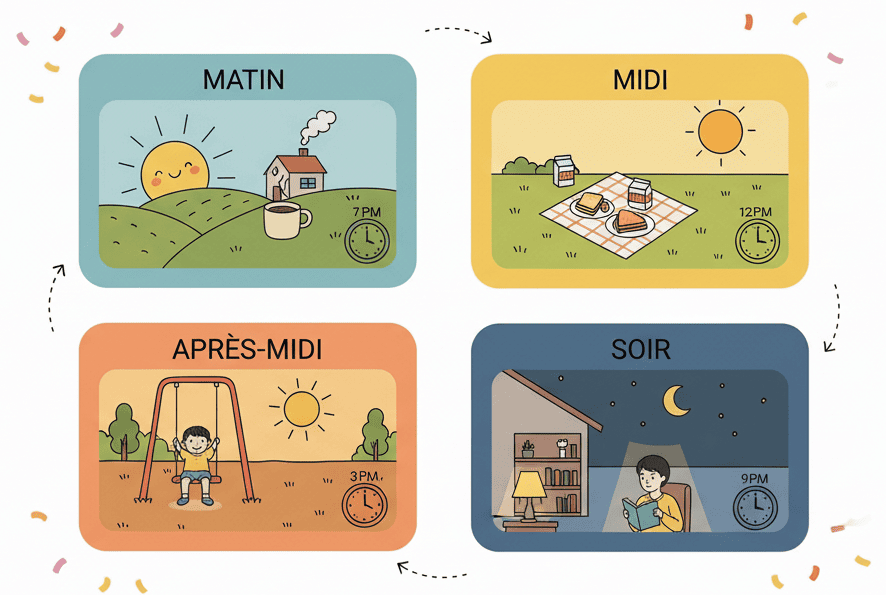 Les jours de la semaine, les heures, les chiffres — tout ce dont tu as besoin pour parler du temps.